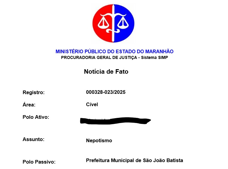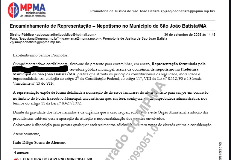 O Ministério Público do Estado do Maranhão (MPMA), por meio da Promotoria de Justiça de São João Batista, instaurou procedimento investigatório para apurar denúncia de *nepotismo* contra o prefeito Emerson Lívio Soares Pinto, conhecido como Mecinho. A representação foi protocolada em 30 de setembro de 2025 pelo advogado Ítalo Diêgo Sousa de Alencar, em nome da servidora pública municipal Marineide Soares Campos.